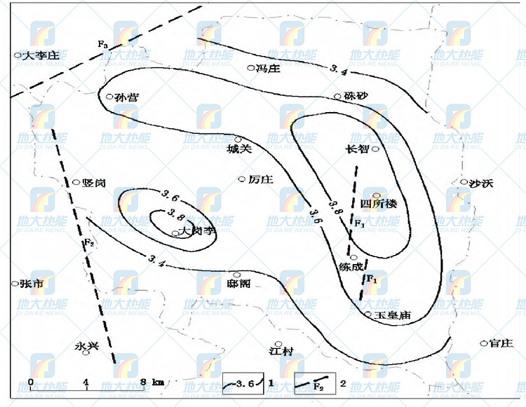 根據地溫梯度計算, 500 m埋深地溫變化范圍32~35℃, 1000 m埋深地溫變化范圍48~54℃。500 m埋深大于34℃的高溫區(qū)及1000 m埋深大于52℃的高溫區(qū)主要分布在長智-四所樓-練成-玉皇廟及大崗李一帶。地溫垂向上隨地層深度增加而增大, 300~500m深度為25~35℃;500~700 m深度為31~40℃;700~1000 m深度為40~53℃;推算1400 m深度地溫達60℃左右。