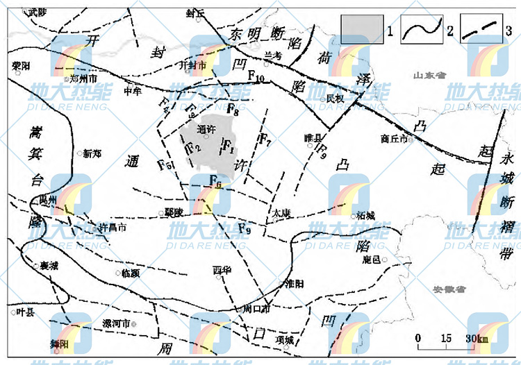 通許隆起大地構造屬巨型秦嶺緯向構造帶的東端和新華夏系第二沉積帶的復合部位, 屬嵩箕山脈的東延。北為開封凹陷及荷澤凸起, 南為周口凹陷, 西至嵩箕臺隆, 東鄰永城斷褶帶。隆起內EW、NE、NW向三組斷裂將基底切割成破碎的斷塊狀, 局部形成新生代小斷陷。通許縣由于處于隆起區(qū)中部 , 斷裂構造不發(fā)育, 對該區(qū)地熱形成有一定影響的斷層有四所樓-練成斷裂 (F1) 、豎崗斷裂 (F2) 、半坡—水坡斷裂 (F3) 、崔橋斷裂 (F6) 、杞縣斷裂 (F7) 、中牟—開封斷裂 (F10) 。