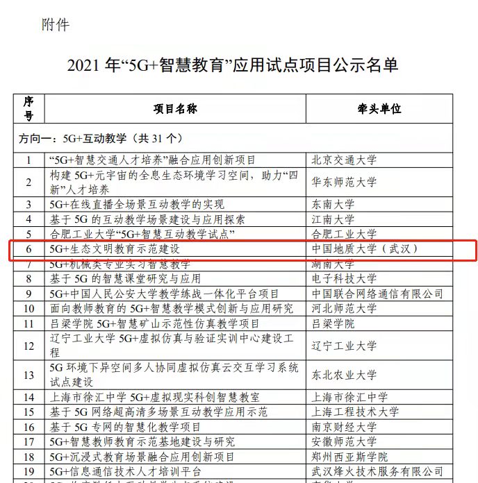 地大新聞網訊:近日,工業和信息化部、教育部聯合公示2021年“5G+智慧教育”應用試點項目入圍名單,我校牽頭申報的“5G+生態文明教育示范建設”項目成功入選。