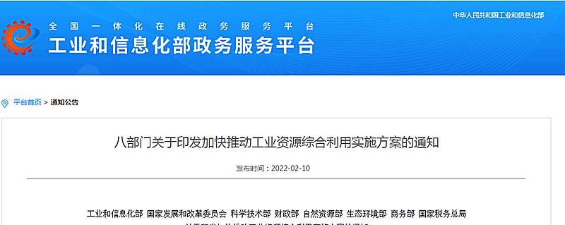 地大熱能地熱+多能互補網訊:2月10日,工業和信息化部、國家發展和改革委員會、科學技術部、財政部、自然資源部、生態環境部、商務部、國家稅務總局等八部門聯合印發了《關于印發加快推動工業資源綜合利用實施方案的通知》(下文簡稱《通知》)。