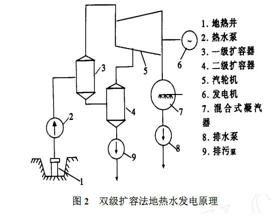 西南電力設計院設計的羊八井地熱電站第1臺試驗機組,容量為1000kW,汽輪機是利用四川內江電廠2500kW廢棄設備改造而成。于1977年10月試運成功,采用單級擴容法熱力系統。若把地熱水送入1個密閉的容器中降壓、擴容,根據水沸點與壓力的關系,可使溫度不太高的地熱水因氣壓降低而沸騰變成蒸汽。由于地熱水降壓蒸發的速度很快,是一種閃急蒸發過程;同時,地熱水蒸發產生蒸汽時,其體積迅速擴大,所以該容器稱為“擴容器”或“閃蒸器”。用這種方法產生蒸汽來發電稱為擴容法地熱水發電。這是利用地熱田熱水發電的主要方式之一,該方式分單級擴容法系統和雙級(或多級)擴容法系統。擴容法系統的原理是:將地熱井來的中溫地熱汽、水混合物,先送到擴容器中進行降壓、擴容(稱閃蒸),使其產生部分蒸汽,蒸汽經過分離器除去雜質(10μm及以上)后,再引到常規汽輪機機發電。
